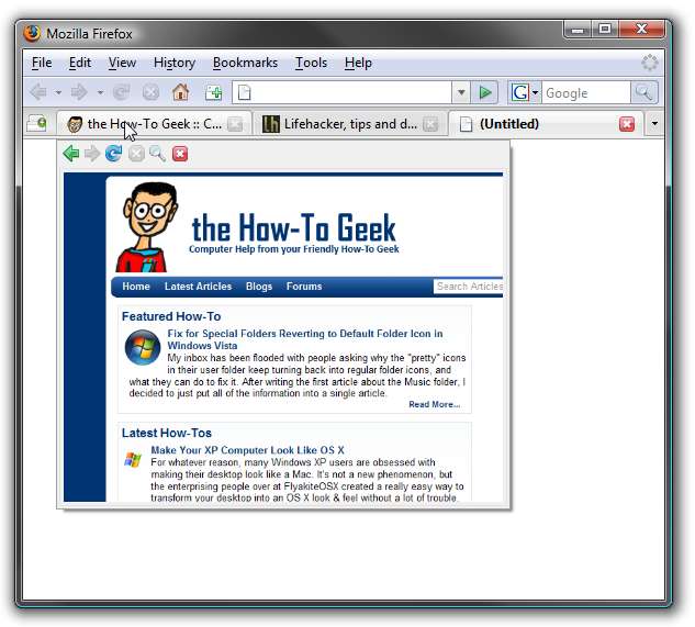 Một trong những tính năng yêu thích của tôi trong Windows Vista là xem trước hình thu nhỏ của thanh tác vụ, đặc biệt là bây giờ chúng có thể được thay đổi kích thước . Nếu bạn muốn có chức năng này cho các tab của Firefox, bạn có thể sử dụng tiện ích mở rộng Phạm vi tab để cung cấp cho bạn một tính năng tương tự.
