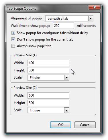 Bạn cũng có thể dễ dàng thay đổi kích thước của bản xem trước cửa sổ bật lên bằng cách sử dụng Tùy chọn phạm vi tab trong Công cụ \ Addons. Kích thước mặc định thực sự khá nhỏ, nhưng bạn có thể làm cho bản xem trước lớn hoặc nhỏ tùy thích.