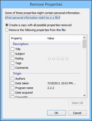 Trên hộp thoại Xóa thuộc tính, bạn có thể tạo bản sao ảnh của mình với “tất cả các thuộc tính có thể có” đã bị xóa. Ngoài ra, bạn có thể nhấp vào “xóa các thuộc tính sau khỏi tệp này”, sau đó chọn hộp bên cạnh mỗi mục bạn muốn xóa.