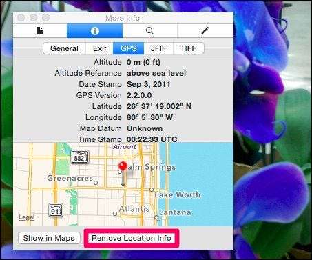 Thật dễ dàng để thực hiện việc này trong Windows, nhưng trong OS X, bạn sẽ phải sử dụng đến phần mềm của bên thứ ba nếu muốn loại bỏ hoàn toàn và dễ dàng siêu dữ liệu khỏi ảnh của mình. Bạn có thể xóa dữ liệu vị trí khỏi ảnh trong Xem trước. Mở ảnh của bạn, chọn Công cụ> Hiển thị trình kiểm tra hoặc nhấn Command + I trên bàn phím của bạn. Sau đó, nhấp vào tab “GPS” và “Xóa thông tin vị trí” ở dưới cùng.