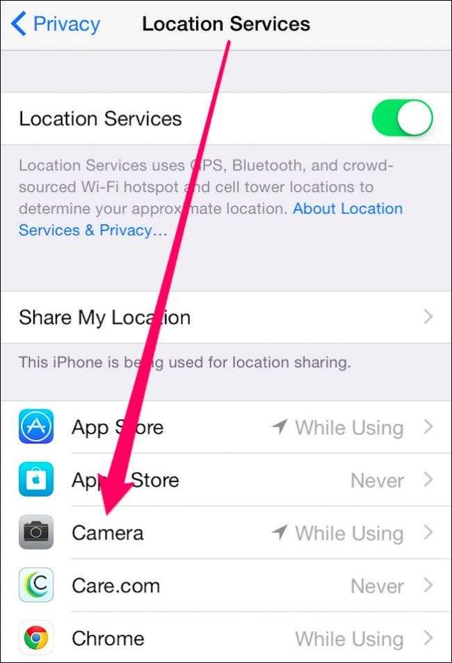 Dịch vụ vị trí cho phép bạn tắt hoàn toàn mọi thứ chỉ trong một lần thất bại hoặc bạn có thể điều chỉnh các ứng dụng và tính năng riêng lẻ. Bây giờ, hãy nhấn vào “Máy ảnh” (bạn có thể điều chỉnh bất kỳ thiết bị nào khác nếu bạn thấy phù hợp).