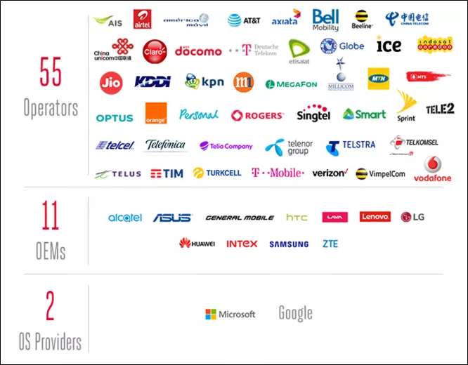 Như bạn có thể thấy, hầu hết các nhà mạng lớn nhất trên toàn cầu đều đã ở đây, cũng như các nhà sản xuất điện thoại phổ biến nhất. Tuy nhiên, bạn sẽ nhận thấy một tên quan trọng bị thiếu trong danh sách này: Apple.