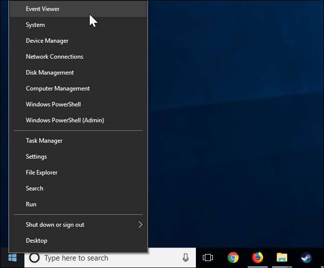 Để xác định quy trình cụ thể nào đang gây ra sự cố với WMI, sử dụng Trình xem sự kiện . Trên Windows 10 hoặc 8, bạn có thể nhấp chuột phải vào nút Bắt đầu và chọn “Trình xem sự kiện” để mở. Trên Windows 7, mở menu Bắt đầu, nhập “Eventvwr.msc” và nhấn Enter để khởi chạy nó.