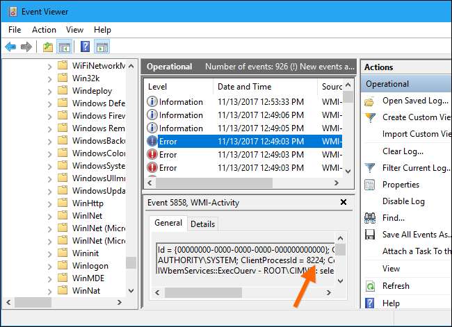 Cuộn qua danh sách và tìm các sự kiện "Lỗi" gần đây. Nhấp vào từng sự kiện và tìm số ở bên phải của “ClientProcessId” trong ngăn dưới cùng. Điều này cho bạn biết số ID của quá trình gây ra lỗi WMI.