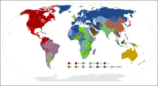 Sơ đồ dưới đây từ Wikipedia cung cấp cho chúng ta một số ý tưởng về cách các hình dạng phích cắm khác nhau giữa các quốc gia. Lưu ý rằng Bắc Mỹ, lục địa Châu Âu, Vương quốc Anh và Úc đều sử dụng các hình dạng phích cắm khác nhau.