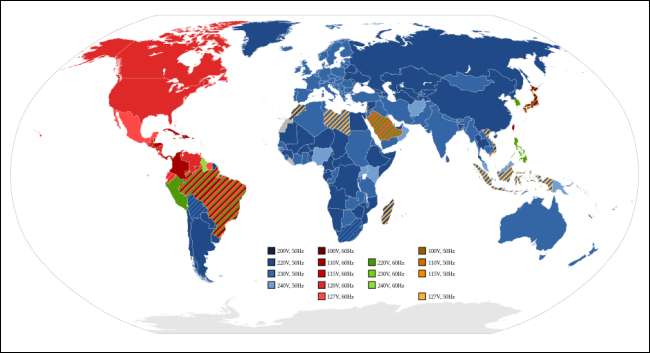 Sơ đồ dưới đây từ Wikipedia cho chúng ta một số ý tưởng về sự khác biệt giữa các quốc gia. Các ổ cắm điện ở Bắc Mỹ cung cấp 120 vôn ở tần số 60 Hz. Các cửa hàng ở Châu Âu cung cấp 230 volt ở tần số 50 Hz. Ở các nước khác, điện áp cũng khác nhau.